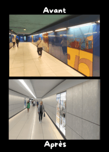 Ce coup de peinture fait à la hâte trouve déjà ses limites, comme l’illustrent les fuites dans la station Saint-Charles qui ont abîmé le nouveau plafond, ou bien les parois glissantes mal raccordées qui salissent rapidement et confèrent une ambiance d’hôpital aliénante et anxiogène. Cette uniformisation produit le contraire de l’objectif recherché en produisant des espaces illisibles. On rate sa station, car tout se ressemble, il n’y a plus aucun repère ou séquençage qui égaye l’expérience de l’usager.