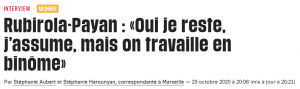 Le 25 octobre, Michèle Rubirola accorde un entretien à Libération où elle affirme désirer mener son rôle de maire en binôme avec Benoît Payan :
