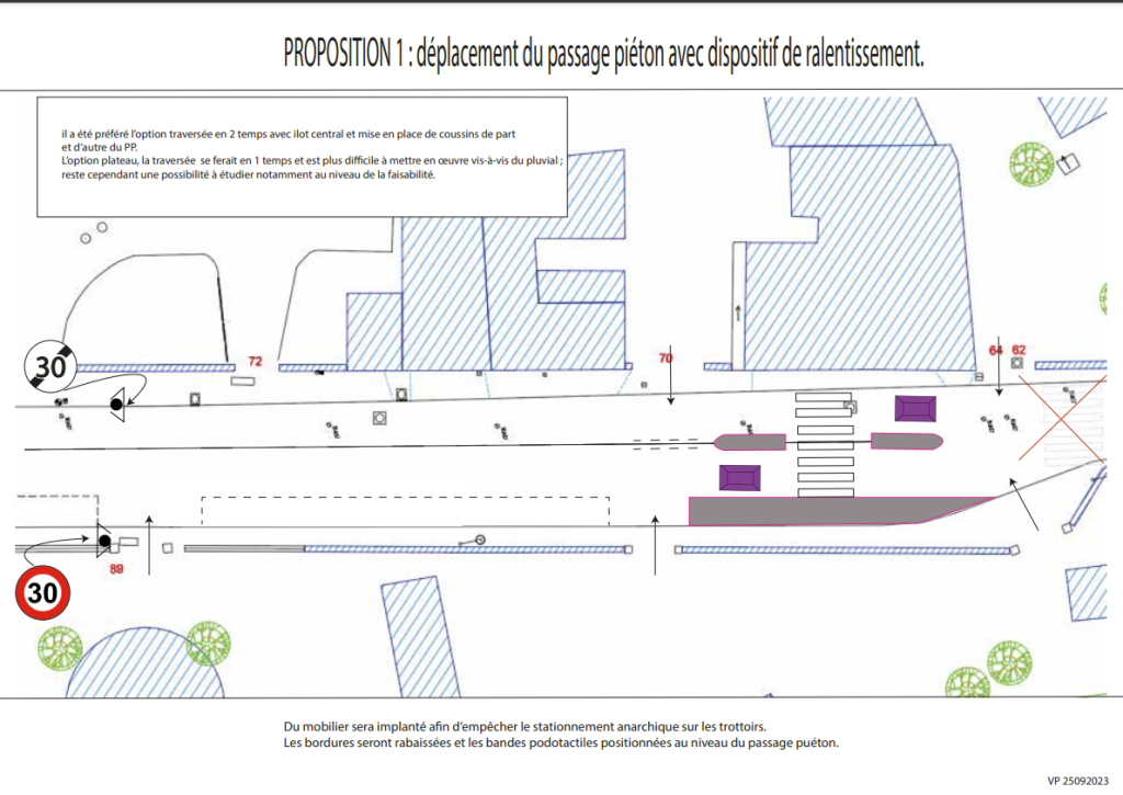 CIQ, à l’issue de laquelle la Métropole proposait de déplacer le passage piéton existant et pour réduire la vitesse au droit du nouveau passage piéton faisait 2 propositions à la mairie :