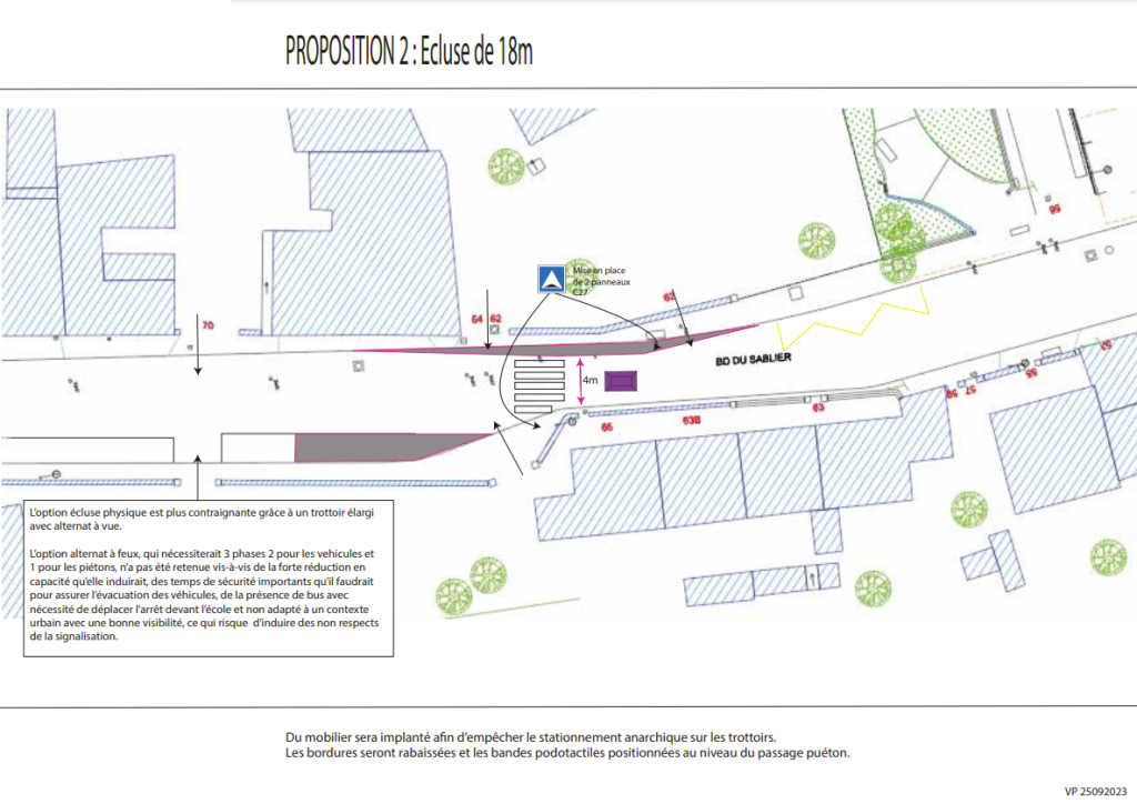 Par ailleurs, nous signalions la dangerosité liée à l’étroitesse des trottoirs du 62 au 102 du Boulevard du Sablier et demandions l’élargissement de ces trottoirs simultanément aux travaux de sécurisation de l’école.