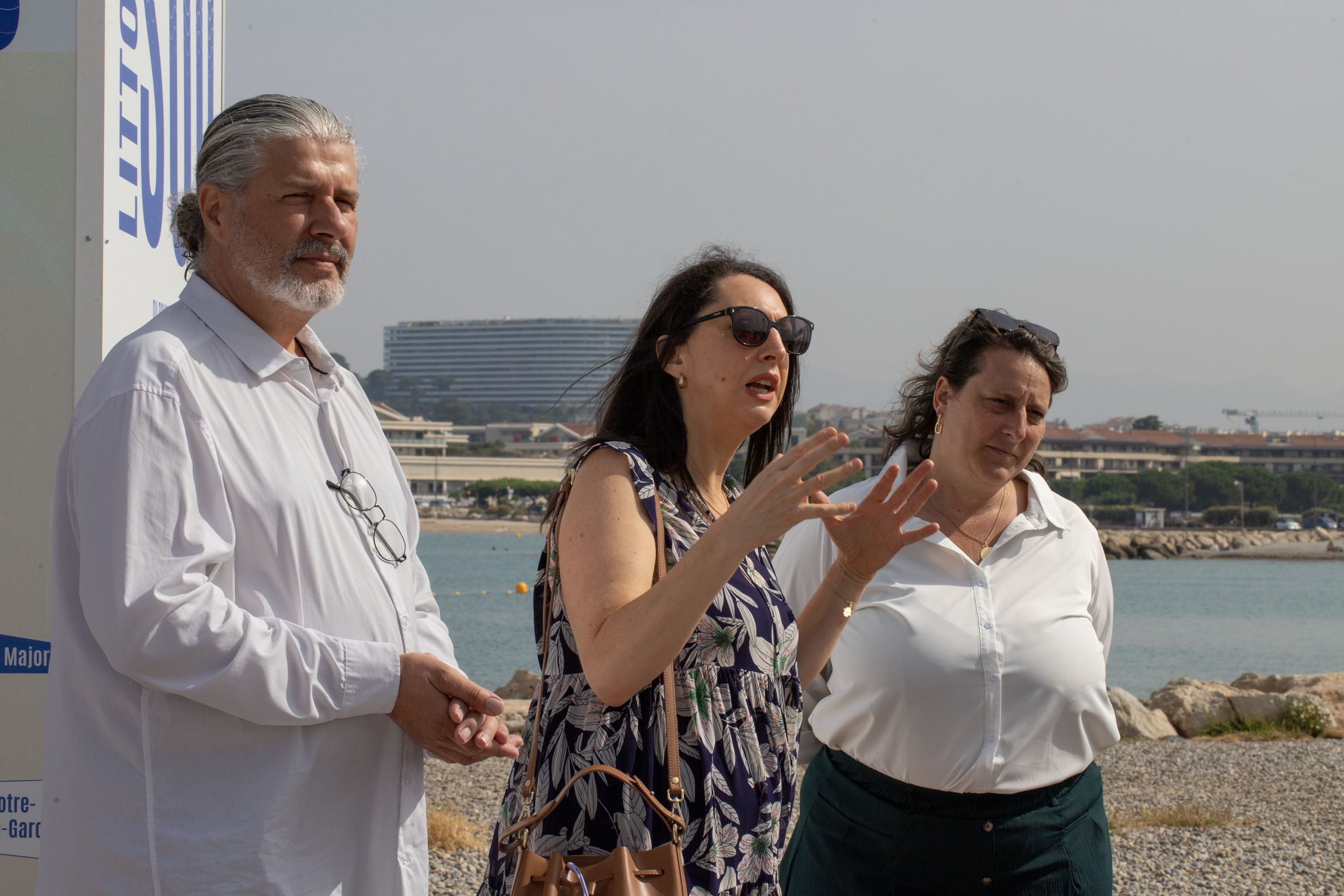 Judith Aziza, entre Hervé Menchon, adjoint à la mer et Olivia Fortin, maire des 6/8, lors de l'inauguration de l'exposition sur l'histoire du littoral sud. Photo : Emilio Guzman.