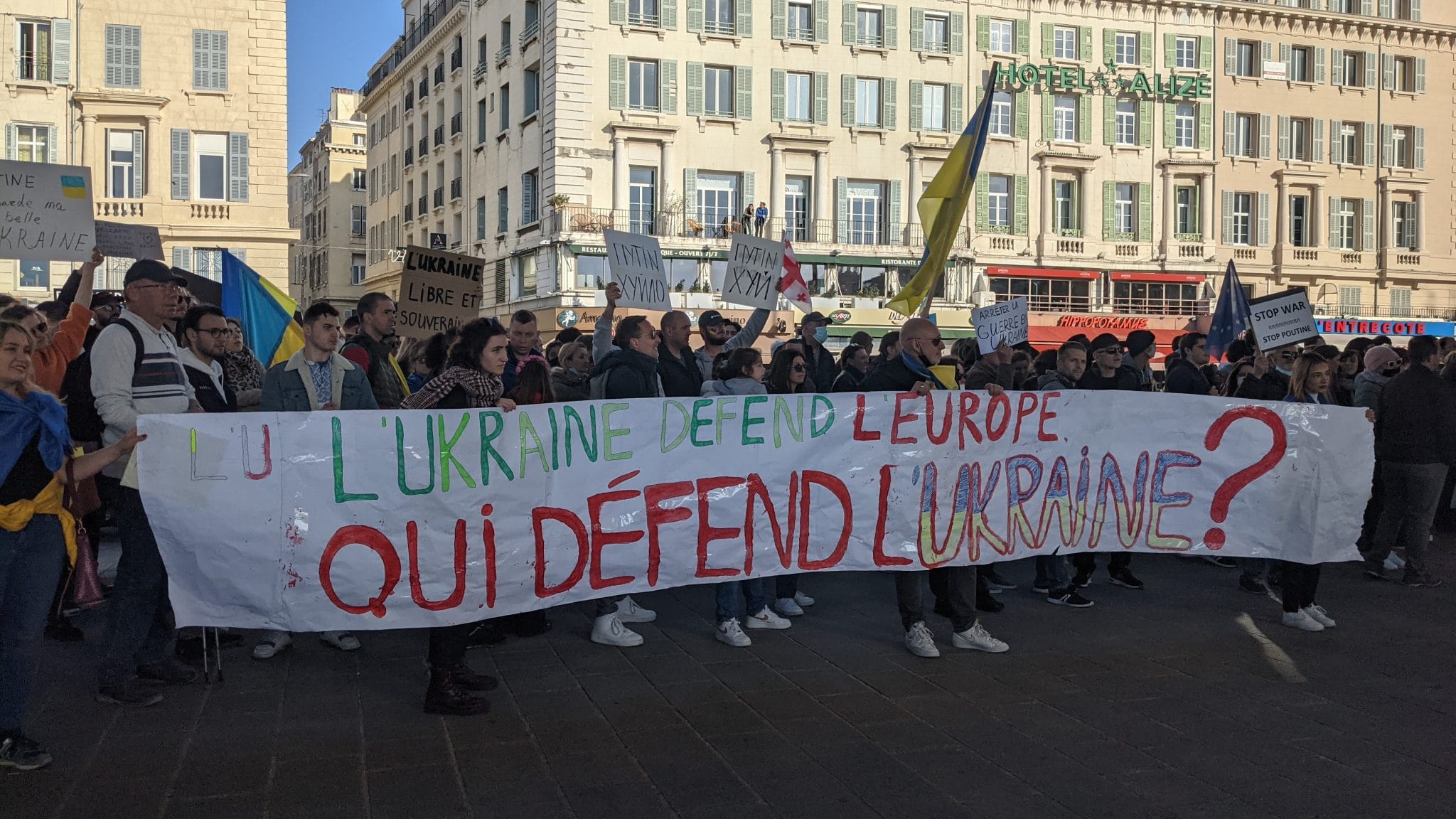 Depuis ce samedi midi, plusieurs centaines de personnes, 700 selon la préfecture de police sont rassemblées sur le Vieux-port de Marseille pour soutenir l’Ukraine et protester contre l’invasion russe. Deux appels distincts avaient appelé à dire non à la guerre. Parmi les manifestants, beaucoup de jeunes Ukrainiens installés en France. “Je ressens beaucoup de tristesse et de la haine contre ce qui est pour moi une injustice, exprime Hanna Antosik, jeune architecte arrivée à Marseille il y a cinq ans. Je suis russophone mais cela ne veut pas dire que je me sens russe. Je suis européenne.” Tandis que la jeune femme a quitté son pays qu’elle considère comme instable pour des raisons économiques et professionnelles, toute sa famille est encore sur place. “Je suis très inquiète pour eux, mais je suis partie pour éviter ça aussi.”