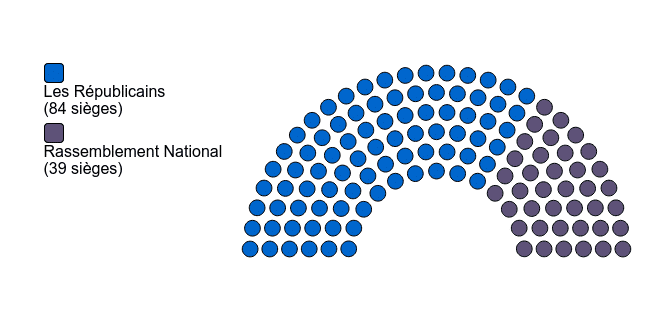 Comme sous la mandature précédente, le conseil est uniquement composé d’élus de droite et d’extrême droite, le rassemblement écologiste et social emmené par Jean-Laurent Félizia s’étant retiré au deuxième tour pour faire barrage au Rassemblement National. La majorité du président LR regroupe dix composantes, dont La République en marche. L’opposition est quant à elle composée de 39 élus du Rassemblement national dont le candidat battu Thierry Mariani.