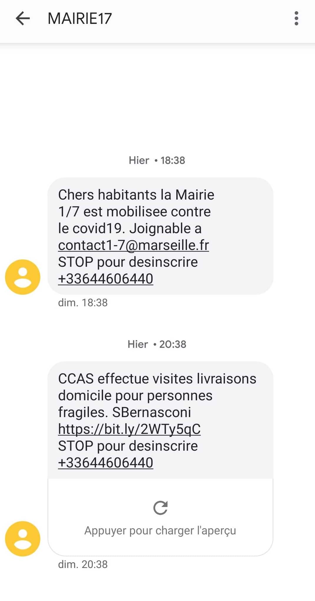 Ce dimanche, à quelques heures d’intervalles, plusieurs administrés des 1er et 7e arrondissements ont reçu des textos de leur mairie de secteur. Le premier indique que la mairie des 1/7 est mobilisée et fournit une adresse mail pour répondre à d’éventuelles demandes. Le second mentionne le fait que le centre communal d’action sociale s’investit au près des plus fragiles en livrant des repas à domicile. Celui-ci est plus personnel puisqu’il se termine par la signature de la maire de secteur, Sabine Bernasconi. Celle-ci est suivi d’un lien vers une page web qui reprend les principales recommandations du gouvernement.
