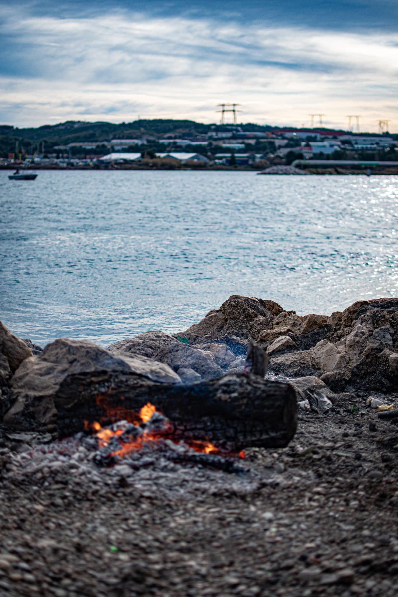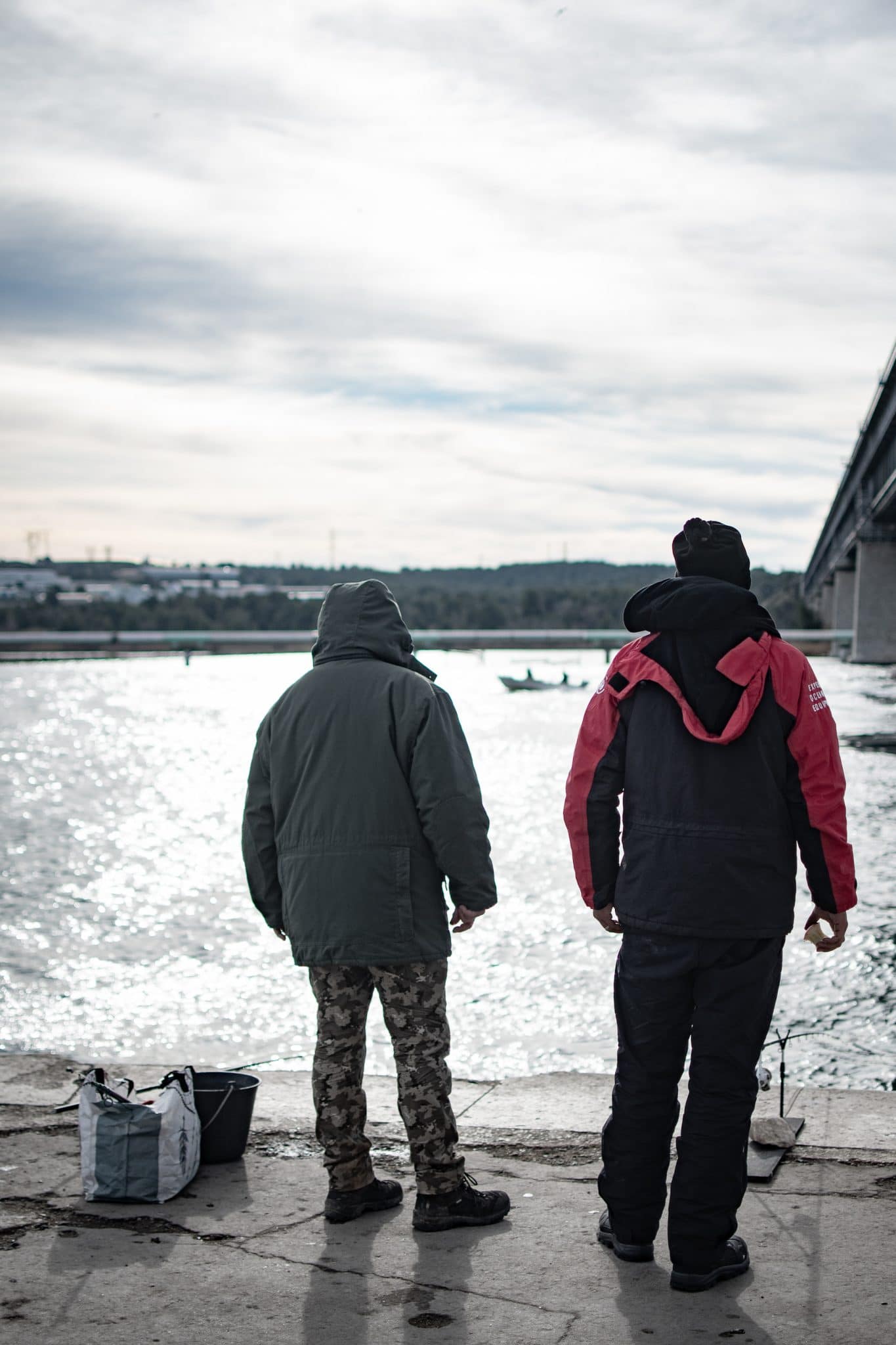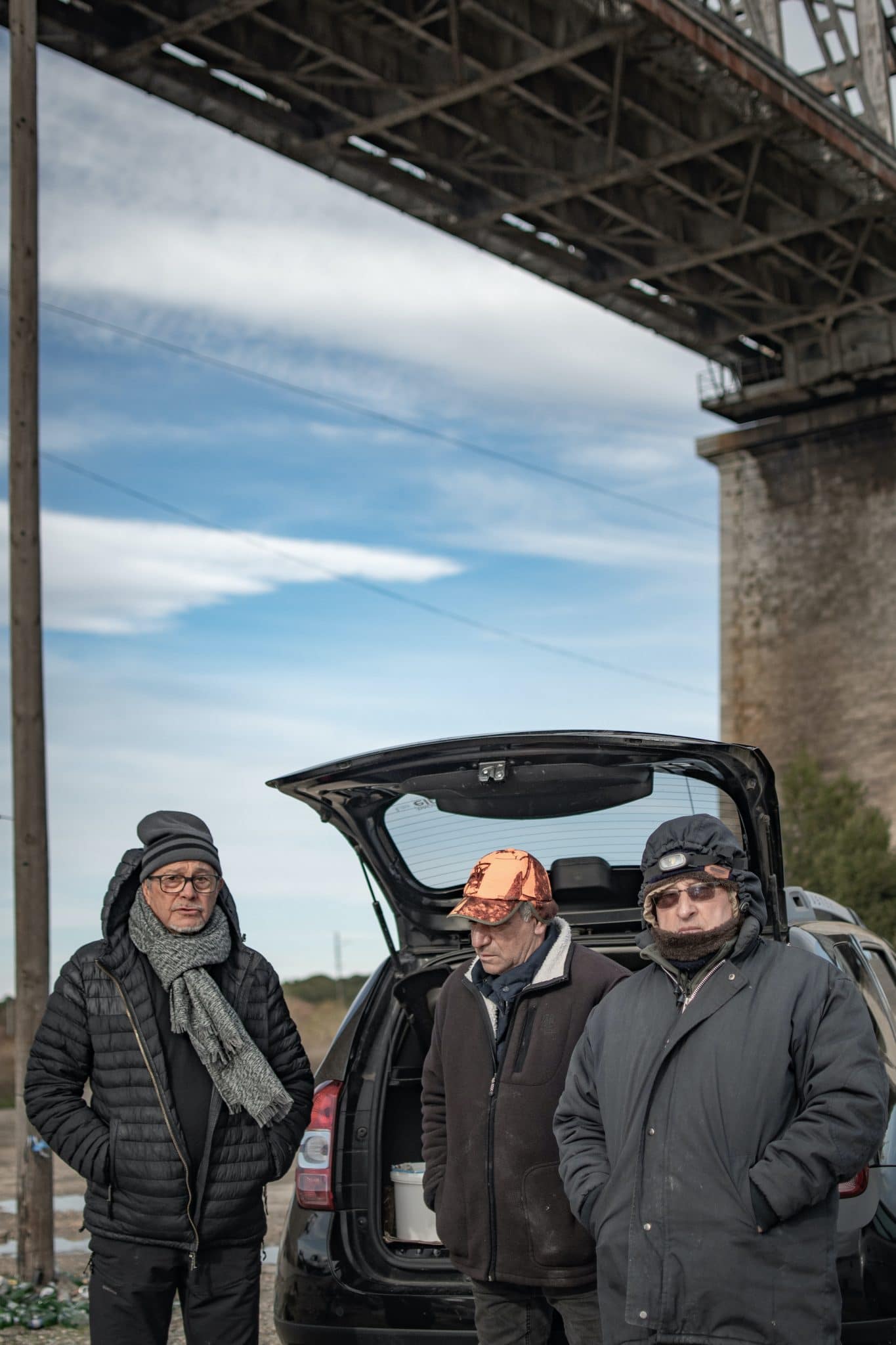 Au pied du pont, au bord du canal, on trouve coffres ouverts et coquilles de moules éparpillées pour la dorade. Il fait froid ce jour-là, il y a du vent, ils ont fait un feu. Cela ne suffira pas à les réchauffer parce qu’ils ne sont pas contents, les pêcheurs de Caronte.