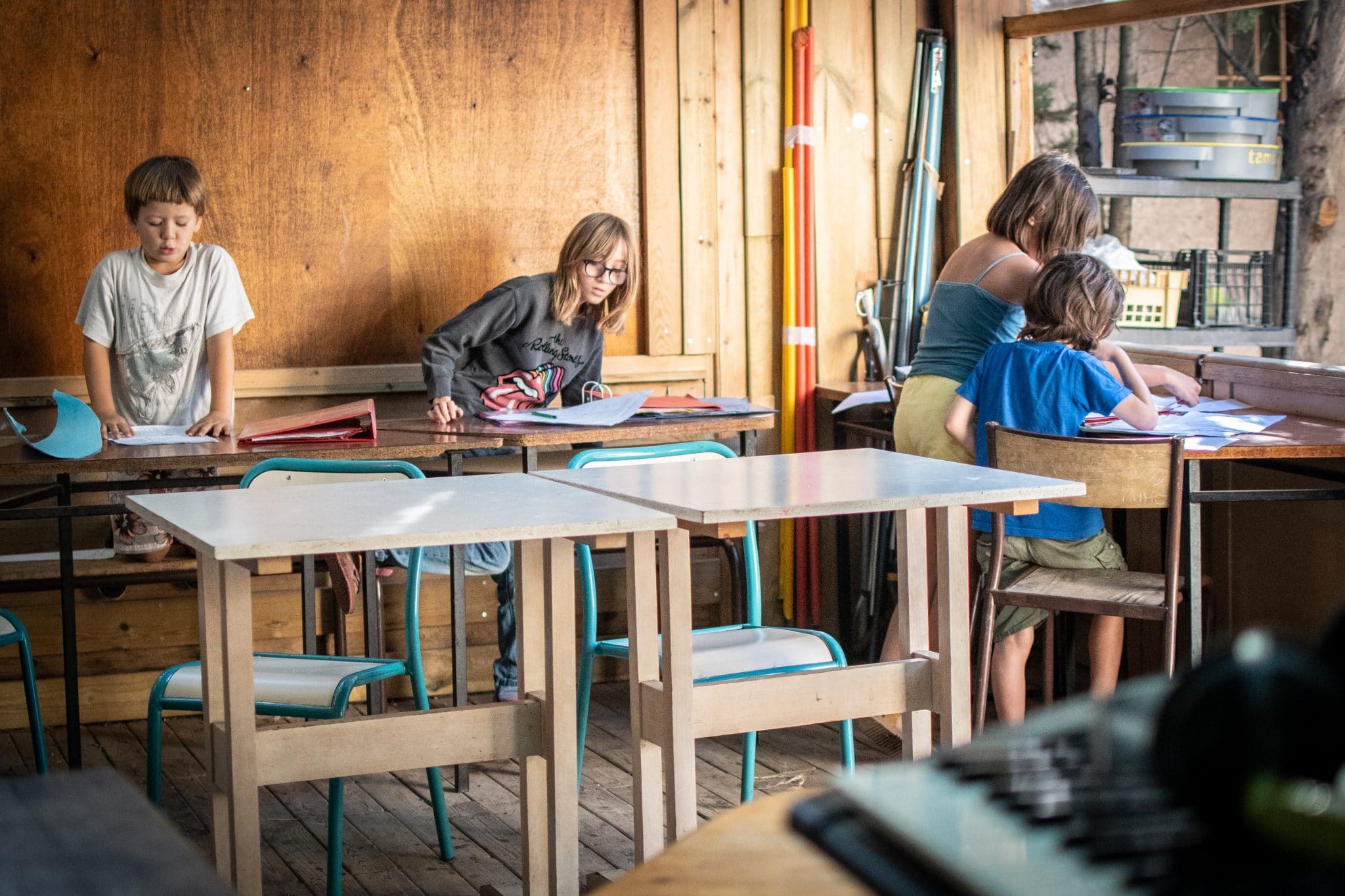 Les arbres, le ciel et le jardin entrent presque à l’intérieur et dedans, c’est aussi presque dehors. L’idée n’est pas de se mettre à part mais bien au contraire de créer le lien avec son environnement proche et avec les autres. Le projet est fragile mais semble fonctionner, les voici à leur septième rentrée.