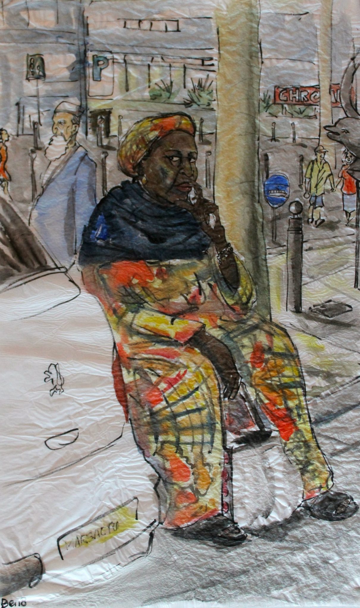 Il s’agit d’une série en pointillé avec de grands écarts entre les points. Elle porte le nom un peu emphatique d’inventaire populaire. Le principe en est simple : comme n’importe quel praticien du centre-ville de Marseille, je collectionne les figures qui trament son quotidien et qui incarnent son identité de ville populaire. Je les coule à l’encre et aux aquarelles sur du papier de soie, glané à la fin du marché de La Plaine. C’est pour cela qu’ils ont l’air froissé. Ils le sont.