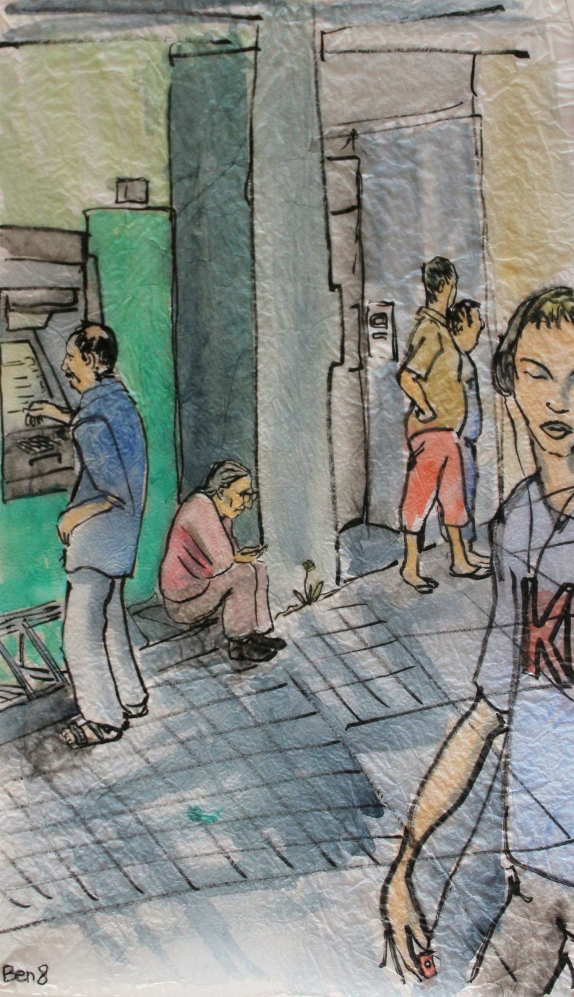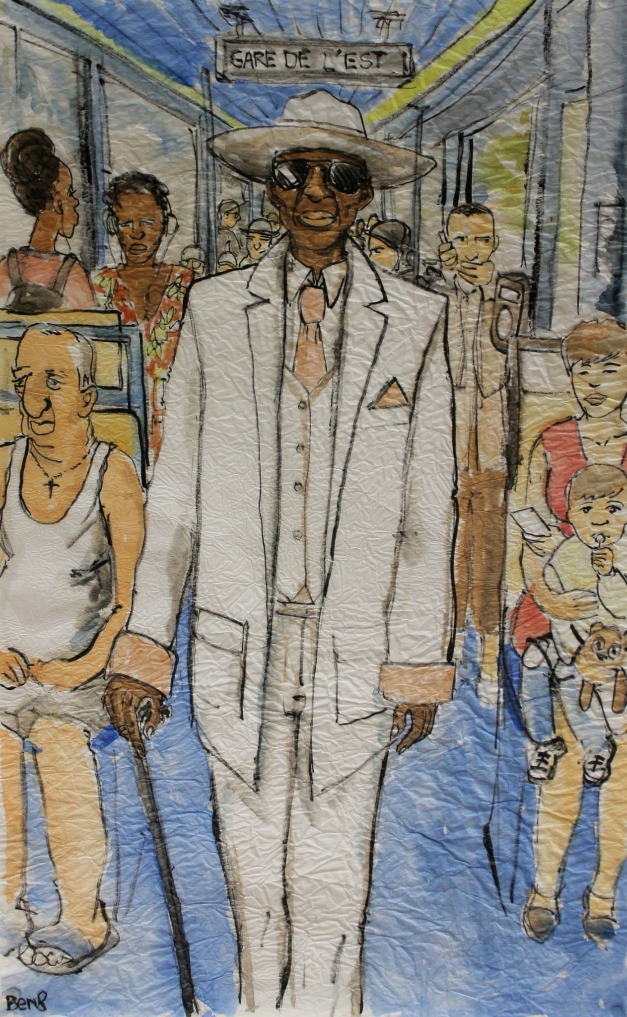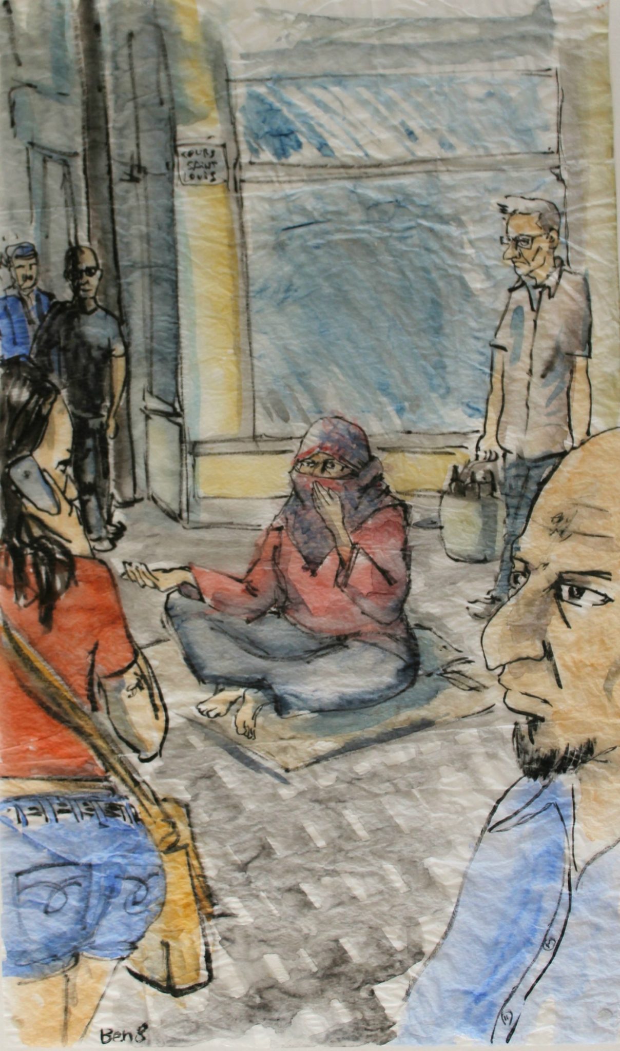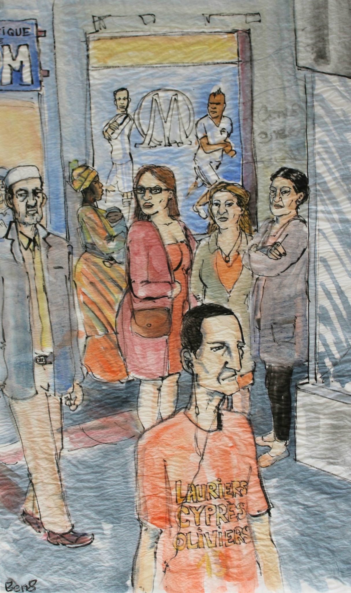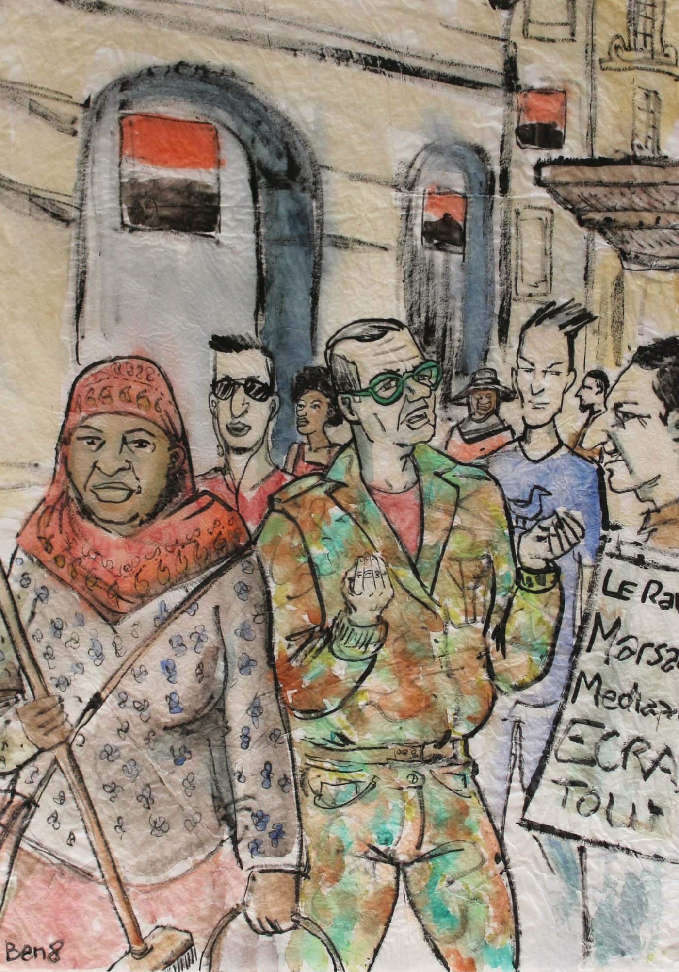 Les aquarelles de Ben8 étaient exposées au théâtre de la Comédie le soir de la présentation du nouveau Marsactu aux “ululeurs”. Très beau travail sur ces papiers de soie froissés qui s’accordent bien aux sujets représentés.