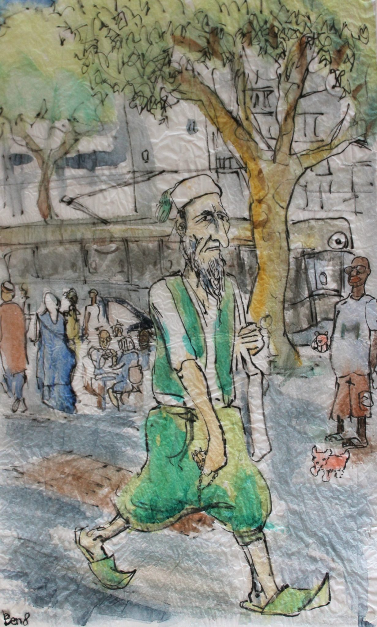 Sa barbe blanche finit en tresse. Toujours vêtu de vert et de blanc, gilet en satin coordonné au sarouel, babouches de la même teinte. Il marche d’un pas pressé, souvent le sourcil froncé. Il s’agirait d’un mage, connu dans la communauté musulmane. Il aurait paraît-il encore la phobie des contacts humains et éviterait de toucher les surfaces effleurées par ses contemporains.