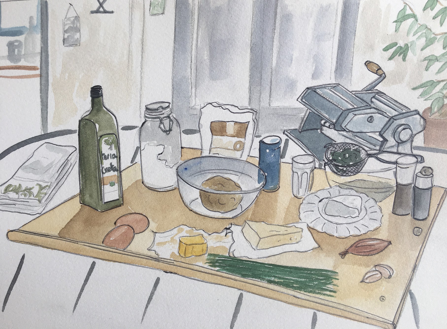 Gerlind installe une rutilante machine à pâtes sur une planche venue du Tyrol. Elle coupe et pétrit un bout de pâte farinée pour qu’elle ne colle pas, la glisse dans la fente de la machine. La pâte s’allonge un peu, elle la farine à nouveau et la repasse dans la machine. Elle renouvelle l’opération, en réglant la machine plus finement à chaque fois. La pâte s’allonge, c’est magique !