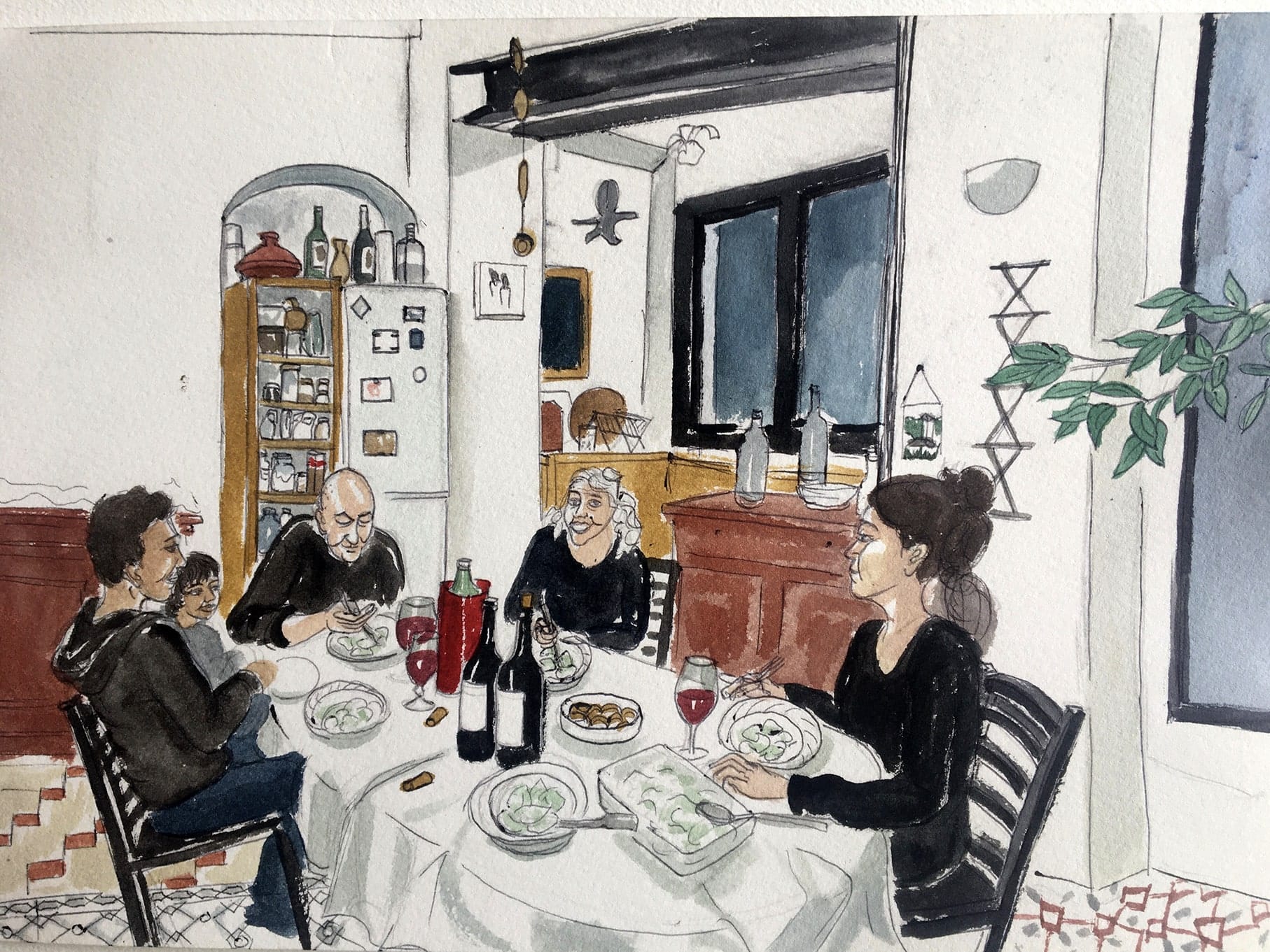 Gerlind et ses amis dégustent les schlutzer après l’apéro. (Illustration : Malika Moine)