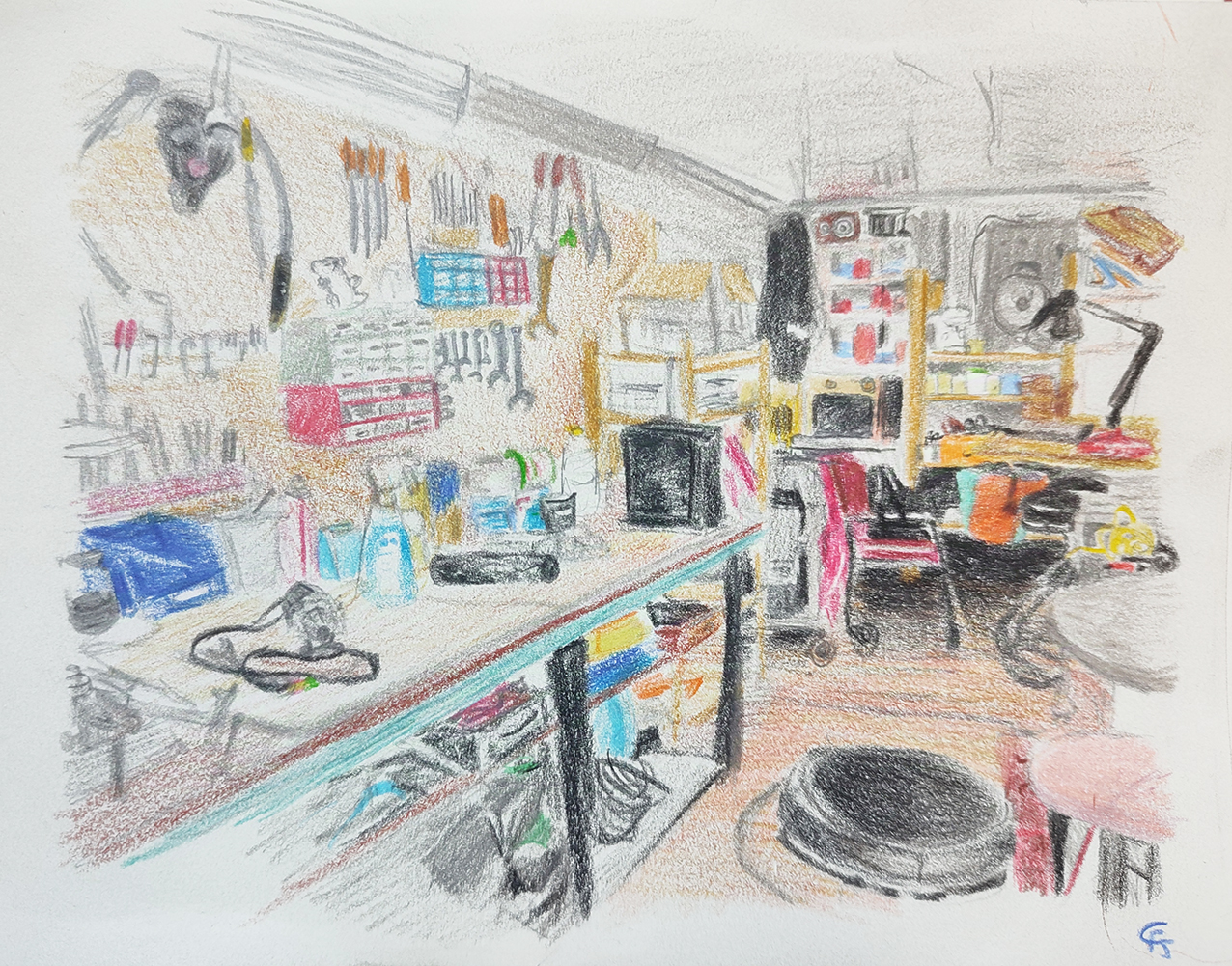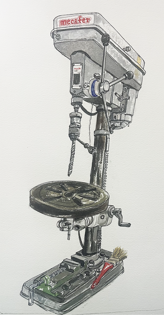 Si pour Mario, “l’outil prolonge la main de l’homme”, un inventaire à la Prévert s’impose pour énumérer les siens. Dans le premier atelier : des composants, des fers à souder, des scies sauteuses, un micro-ondes pour manger, une perceuse à colonne que j’ai décidé de dessiner, des tarauds pour fabriquer des écrous, des clés à molettes de toutes tailles, des tournevis et j’en passe…
