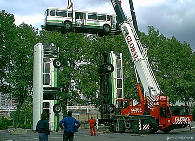 Installation de bus à la verticale, comme celui planté à l’entrée de la Cité des arts de la rue.