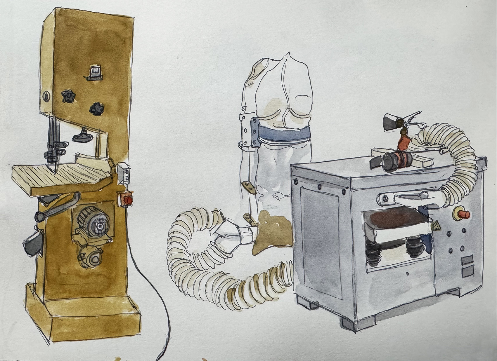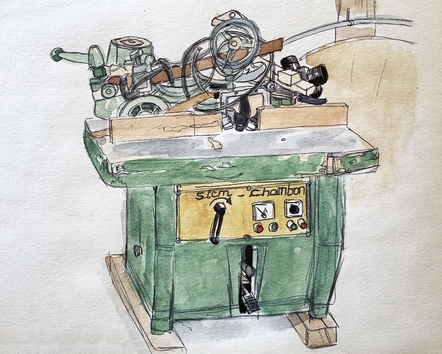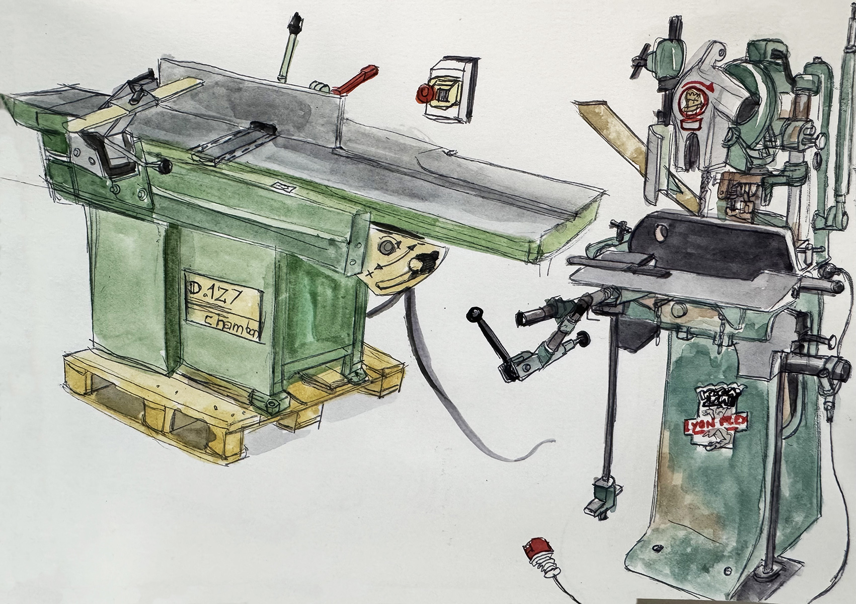 Il y a aussi une sorte d’aspirateur géant, “une aspiration d’atelier pour les copeaux et la poussière”. Et puis “la raboteuse, un outil pas très esthétique à dessiner, mais une super machine. Quand le bois est passé par là, il est clean et prêt à être travaillé”.