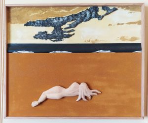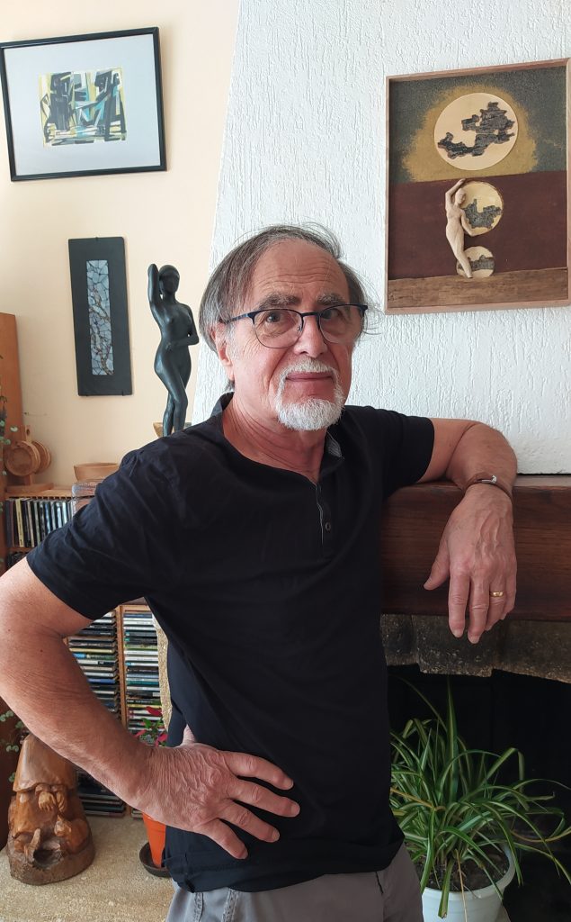 Je découvre en cheminant dans la maison jusqu’à l’atelier le travail d’Alain, des rondes-bosses — sculptures en trois dimensions — et des bas-reliefs en bois. “Au Moyen-Age, on ne distinguait pas l’un de l’autre, on appelait ça des « Ymages ».” Je m’étonne devant la diversité des matériaux. “Je les glane ici et là : pierres, écorces, bois, fer…”, m’explique Alain. Sur des fonds d’ocre, de sable ou de bois, une femme nue traverse les époques, les thèmes et les inspirations, #MeToo, la guerre, les migrants, des poèmes de Prévert, des chansons de Ferré…