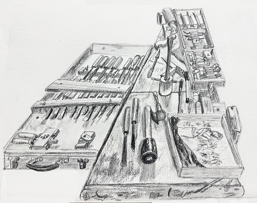 Les outils d’Alain Gilles. (Illustration : Malika Moine)