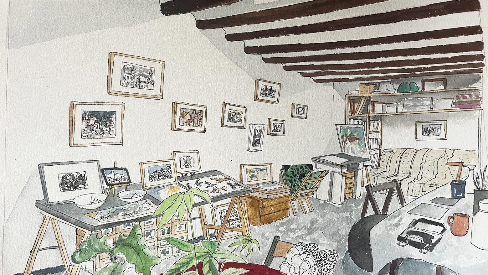 C’est pourquoi je citerai l’enceinte comme l’un de mes outils essentiels. Lorsque je regarde un dessin, je me souviens comme une réminiscence de ce que j’écoutais lors de sa réalisation. Mes outils, c’est aussi bien sûr en premier lieu ma boîte d’aquarelles… elle m’accompagne dans mes pérégrinations et reste centrale à l’atelier. Les pinceaux… les pinceaux à réservoir, indispensables en balade, concerts et autres évènements impromptus, pratiques aussi à l’atelier. Pour les grands aplats, je leur préfère les beaux pinceaux petit-gris, qui ont une grande réserve d’eau. C’est en peignant les ciels que j’ai pris la mesure de l’importance de la qualité du papier aquarelle. Les encres sont devenues incontournables dans mon travail. Moi qui ai appris à écrire avec un porte-plume, un encrier et un buvard, je m’y adonne quarante ans après dans mon atelier.