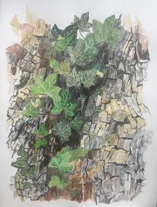 Il faut vous dire, aussi, comme mon ordinateur m’est précieux : non seulement pour les travaux d’infographie nécessaires à l’édition, mais également pour dessiner. À la plume d’après mes photos de murs par exemple. Et grâce à cet outil extraordinaire, je zoome, me balade dans l’infiniment petit, reviens à une vue d’ensemble… Ça m’amène aussi à peindre sur de plus grands supports, à faire des encres sur du format raisin. Parmi mes outils encore, les crayons de couleurs, les feutres, tellement vifs et précis. Et le merveilleux crayon gris et gras ! Sans parler des craies et autres fusains qui induisent un autre trait, une autre énergie. Et la peinture. Gouache ou acrylique, pour rehausser l’aquarelle, et même… la peinture à l’huile… je tâtonne, l’été, la fenêtre ouverte en oubliant le temps qui passe, fascinée : pouvoir changer la couleur d’un tronc d’arbre sur ma toile.