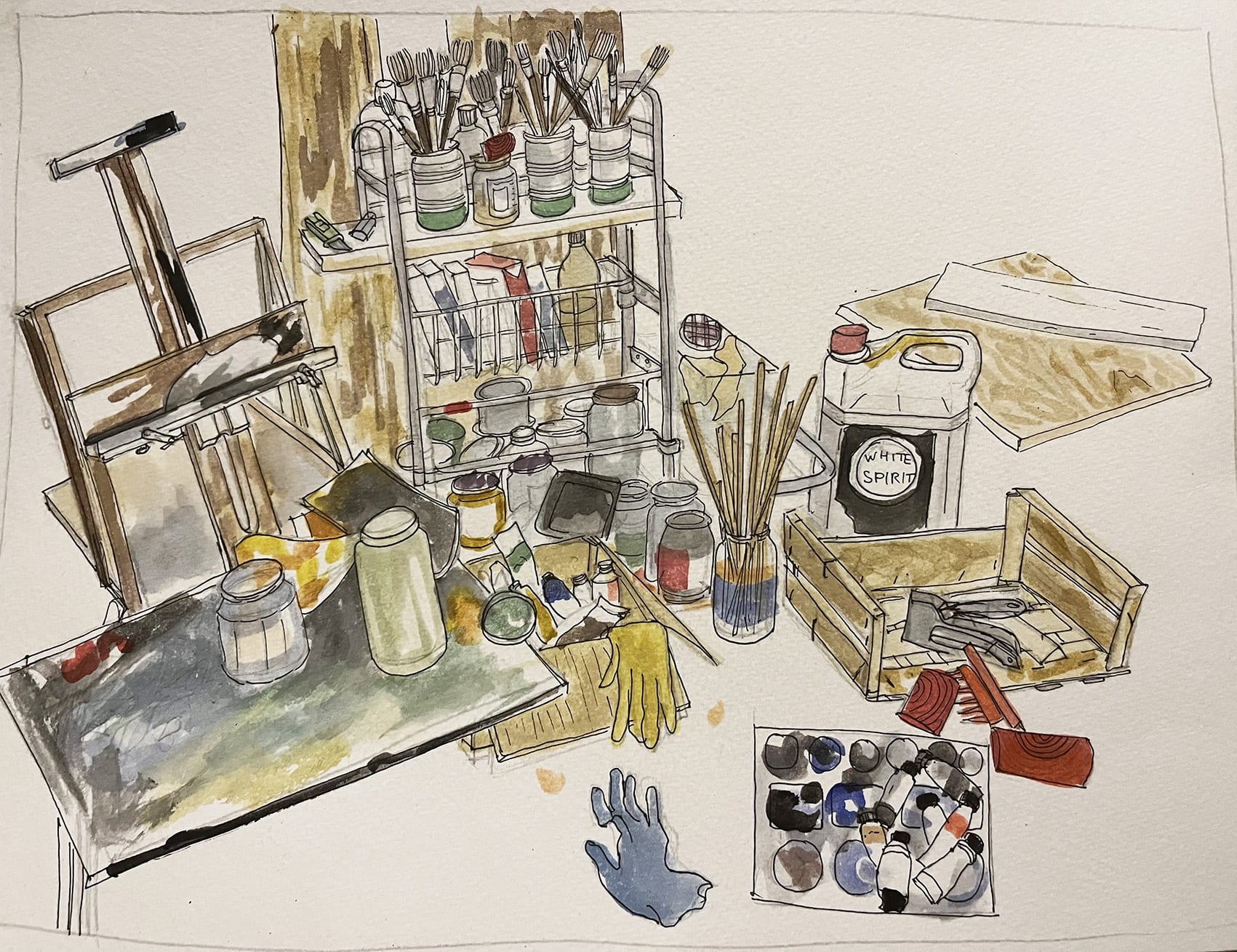 “Je ne suis pas un fétichiste des outils. J’ai des pinceaux, je ne les jette jamais. Je fais mes constructions avec de la colle à bois et des cagettes. J’utilise des tubes d’aquarelles à l’atelier, c’est plus commode pour les grands formats, et en voyage, je travaille avec une boîte d’aquarelle à godets. Je peins aussi à l’huile. Aujourd’hui, j’aime bien peindre dans le frais. Avant, je travaillais dans des couches, des superpositions.”