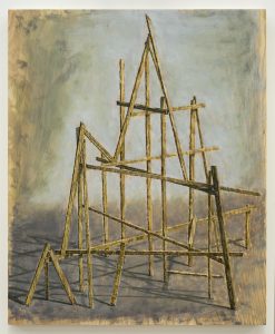 Des structures de bouts de cagettes en bois, collés et montés comme des cathédrales sont échafaudées ici et là. Il précise : “Je me suis inspiré de charpentes métalliques du XIXe siècle, qui ont servi de faux rochers dans le zoo de Vincennes, et d’une structure de fausse montagne d’un parc d’attraction des années 50 aux États-Unis… J’ai toujours peint des montagnes, c’est une sorte de continuité…”