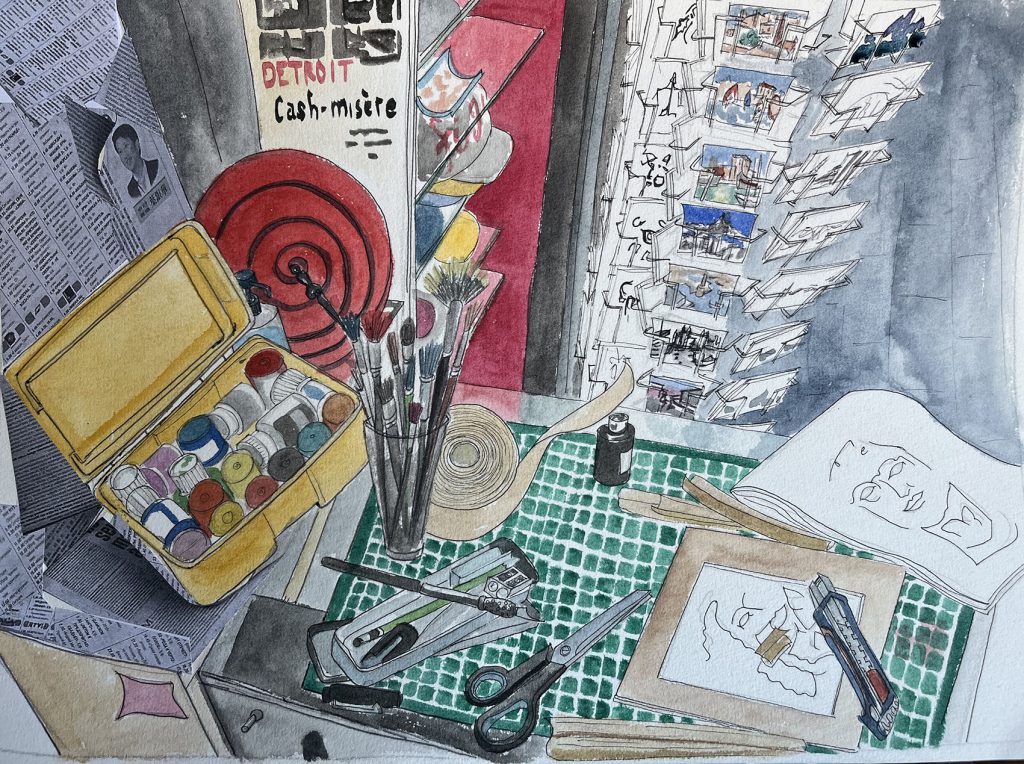 Après s'être invitée dans les cuisines des Marseillais, la dessinatrice Malika Moine part à la découverte des ateliers d'artistes. Pour Marsactu, elle et ses crayons se glissent dans les coulisses de la création, pour raconter des lieux qui en disent parfois autant que leurs occupants.