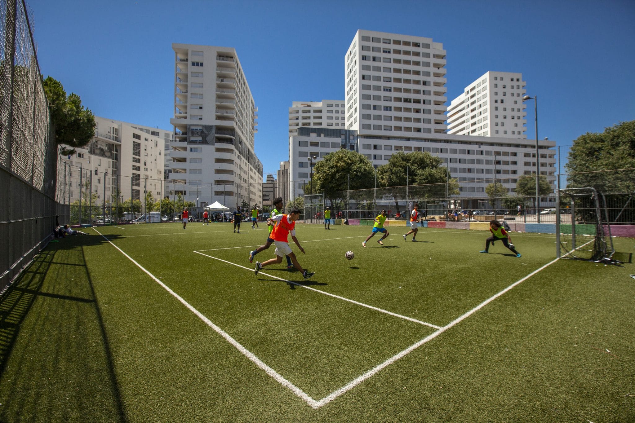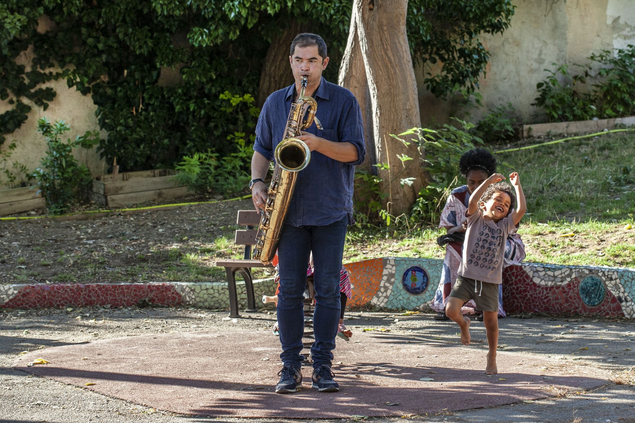 Emilio Guzman a promené son objectif dans cet entre-deux estival : la lumière des jeux d’eau au pied des tours, la quiétude ombragée du jardin Spinelly, une association d’habitants qui donne vie à cet espace communautaire où picorent les poules et soufflent les saxos.