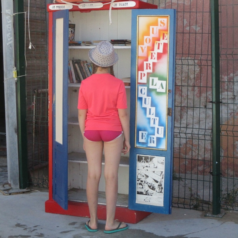 Nouveaux Usages du Livre : L’objet livre a perdu beaucoup de valeur. Il en résulte de nouveaux usages. Ne nous fions pas à l’acronyme, ces N.U.L. (Nouveaux Usages du Livre) ne sont pas tous déplorables. Celui qui consiste à réserver ici et là dans la ville des bornes d’échanges est même excellent. Le ventre du girafon de la Canebière (voir à ce propos l’item Vitria) ne désemplit et la bibliothèque installée chaque été par les compagnons d’Emmaüs sur la plage des Catalans fait le ravissement des baigneurs en mal de culture.