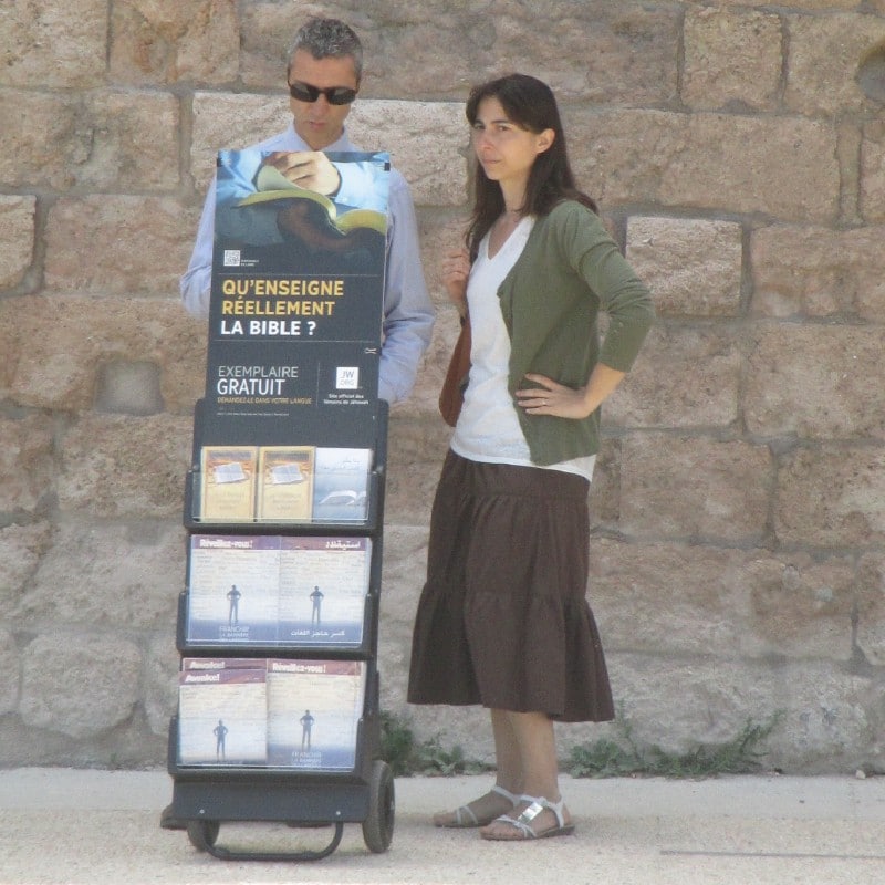 Bible : Ils sont imbattables ces couples qui font le pied de grue de chaque côté d’un éventaire roulant. Ils invitent les passants à lire la Bible et rien n’indique qu’ils rencontrent beaucoup de succès. Qu’importe, ils persistent dans leurs œuvres prosélytes. Sérieux et muets comme une pauvre Ève et un pauvre Adam définitivement chassés du paradis.