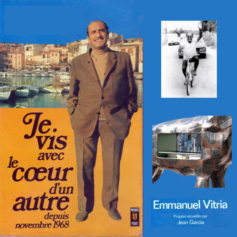 Vitria dans le girafon : C’était le temps où, avec les remblais du chantier du métro, Gaston Deferre faisait des gros pâtés du côté du David. Jean-Claude Juan commentait à la télé régionale les résumés des matches de l’OM en prenant bien soin de ne faire aucune répétition. Maria de Rossi chantait : “Celui qui me plait, il est de Marseille, celui qui me plaît, il est marseillais”. On consommait du cannabis sous toutes les formes, on vivait même en communauté. C’était l’époque où Emmanuel Vitria, le premier transplanté, faisait du mini-vélo dans les allées de Borély. J’ai trouvé son livre dans le ventre du girafon de la Canebière. Il est mort en 1987. Son cœur neuf avait tenu 15 ans.