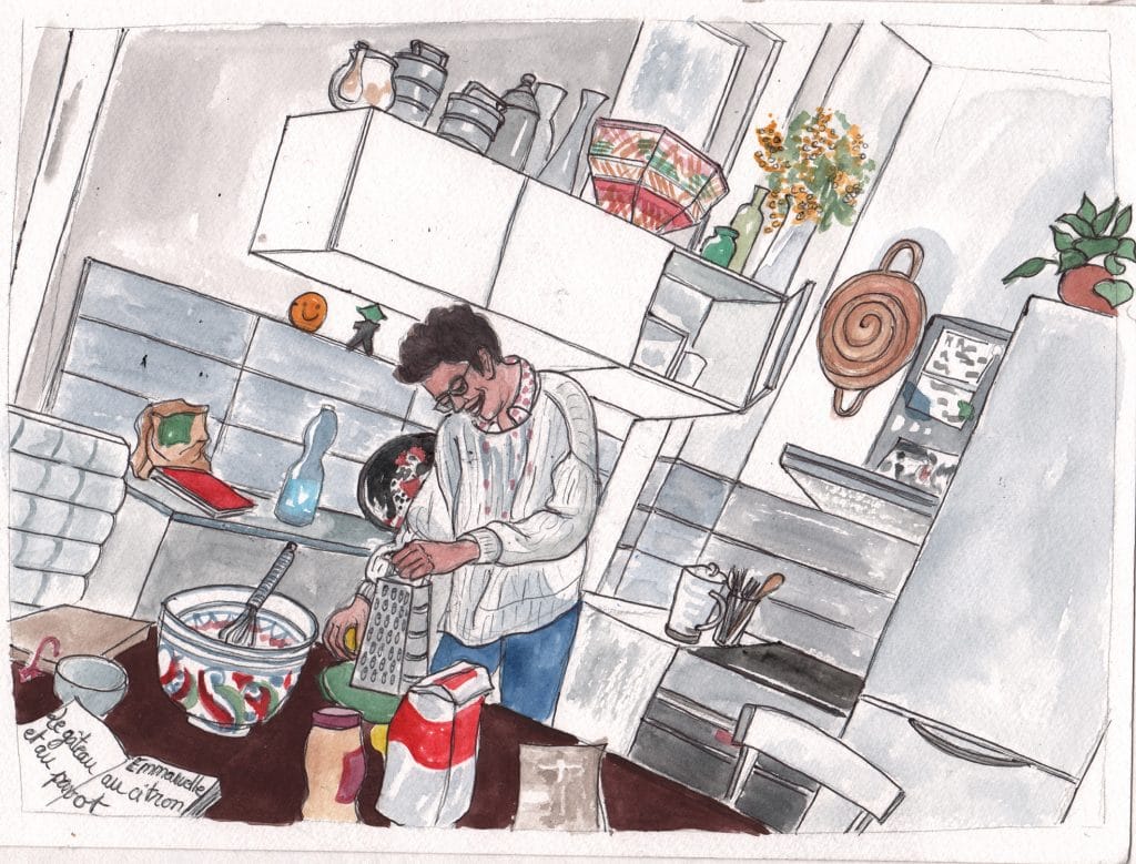 Je ne saurais dater depuis quand je croise Emmanuelle, cette grande jeune femme, au visage doux et lunaire, au regard bienveillant et au salut infaillible. On a échangé nos premières paroles il y a peu et elle a répondu avec gentillesse le mois dernier à ma recherche de volontaire pour une chronique, me proposant cette recette de gâteau avec “des citrons du jardin”. J’ai montré récemment des dessins d’olivier réalisés près d’un village perdu du Delta de l’Ebre, en Espagne, où une amie proche a un cabanon et où Emmanuelle a passé une partie de ses vacances chez ses oncles lorsqu’elle était enfant. Ça rapproche !