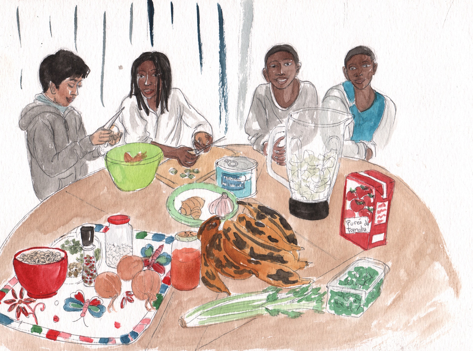 Véronica donne à Ellia les instructions pour couper les oignons en petits carrés tandis qu’Alberta coupe en dés le cèleri. Elle parle aux enfants en anglais depuis peu. Ils comprennent davantage le fantse. Jerry, son mari, parle le twi. Les enfants comprennent les deux langues, mais les parlent peu.