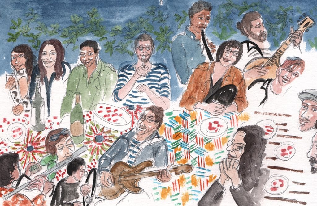 Fred sort sa clarinette, Angel sa basse, Antoine son luth, Perline sa flûte traversière et Kevin une percussion. La précieuse soirée se poursuit.