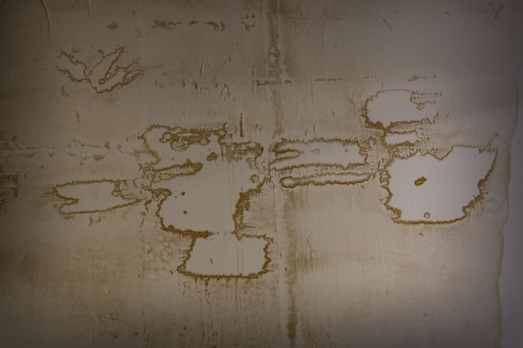 Je suis cette dame, elle marche d’un pas enjoué devant moi et me conduit dans le sous-sol devant un mur dégradé. Là où, effectivement, je ne vois que de la moisissure, elle m’explique les différents continents des morts que, selon elle, révèle cette mappemonde d’outre-tombe.