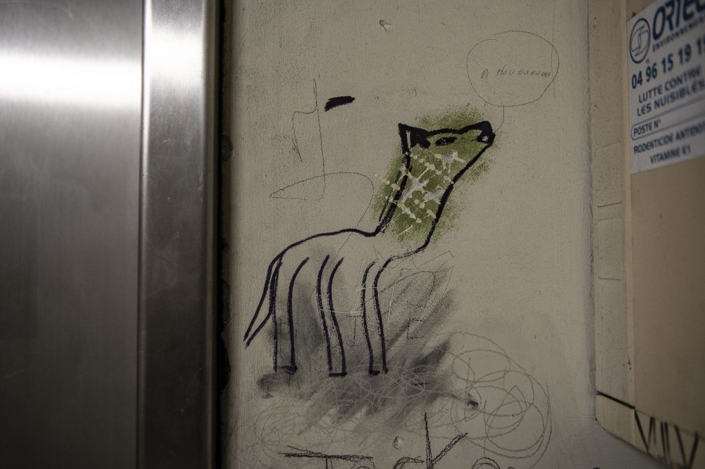 Non, je ne vois pas vraiment et reste muet devant cet amas de déclarations sexuelles, parfois racistes, et ces dessins primitifs. “Ce sont aussi eux qui dessinent ces animaux disparus“, dit-elle en désignant une espèce de biche stylisée. Puis, subitement, elle met fin à son assistance, par un retour brutal aux réalités domestiques : “Bon, je vous laisse, je dois dîner, sinon ils vont râler à la maison.”