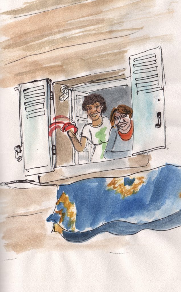 Des applaudissements et des chants nous avertissent qu’il est 20h. Ravie de voir ce 20h pour la première fois d’ailleurs que de chez moi, je vais goûter à la ville au soir qui tombe, heureuse d’avoir eu, malgré tout, ce moment de convivialité, d’histoires, et de gourmandise avec Anne.