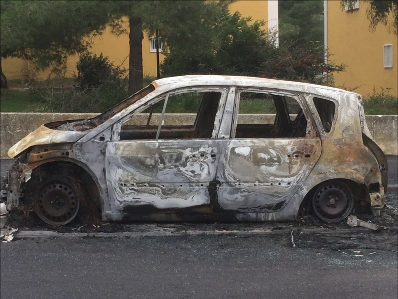 Il en est des écrivains comme des saints de l’Église catholique. Les uns sont béatifiés (ou accèdent aux noms de rue) longtemps après leur décès, les autres chaussent l’auréole à peine froids. C’est ainsi que notre ville a décidé de propulser Yann de l’Écotais, auteur d’une trilogie phocéenne, au panthéon de la toponymie urbaine de son vivant même. Errant du côté du chemin de Sormiou, j’ai cherché vainement la plaque correspondante. Infoutu de la trouver dans ce quartier bouleversé par la promotion immobilière, je me suis rabattu sur ce véhicule récemment incendié.