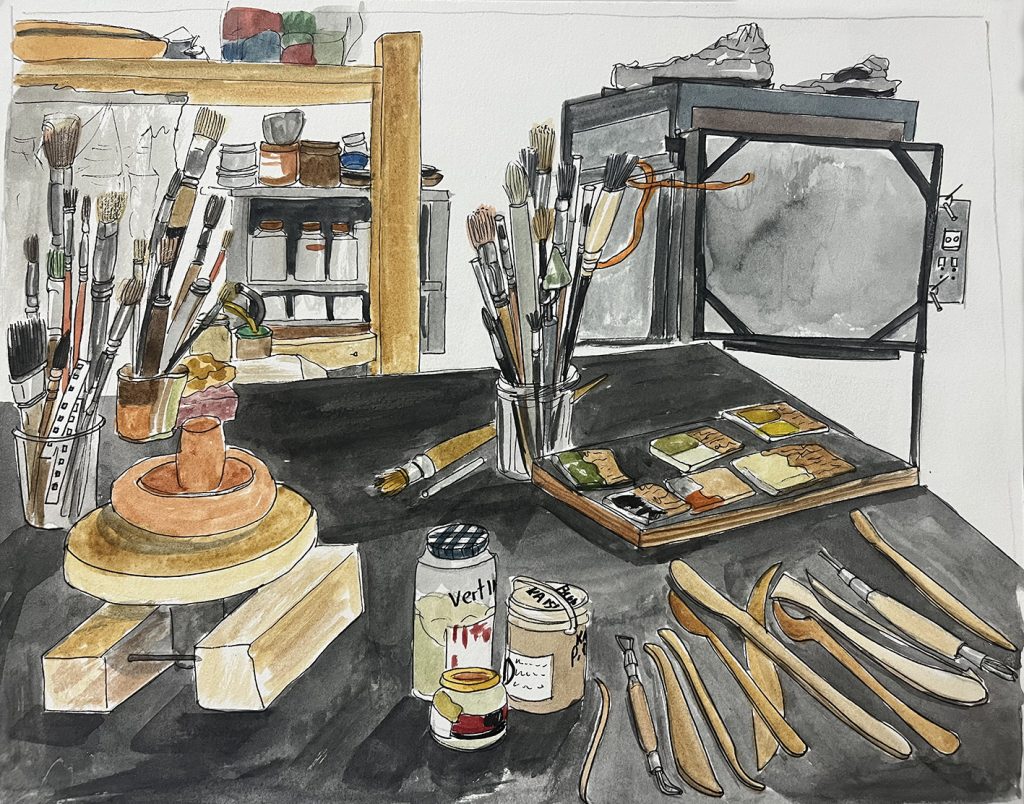 Marie m’invite à entrer. La première pièce surplombée de poutres imposantes, ceinte d’étagères bien remplies de matériaux, entre les deux fenêtres, un four de céramiste, une table couverte de pinceaux et autres spatules…
