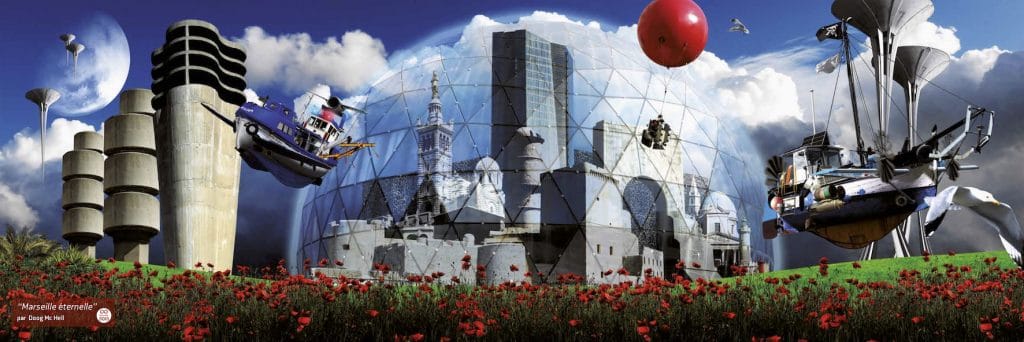 Mais aussi une tentative d’imaginer un “Marseille en grand” dystopique, où l’on pourrait sautiller “d’un métro automatisé à l’autre, de bus en bus, de Gèze à la Fourragère, de Frais-Vallon à la Pointe Rouge et de tram en tram pour y déposer vos enfants dans des micro-écoles flambants neuves où il·elle·s n’apprendront pas seulement les maths et l’occitan, mais pourront y suivre une formation militaire”.