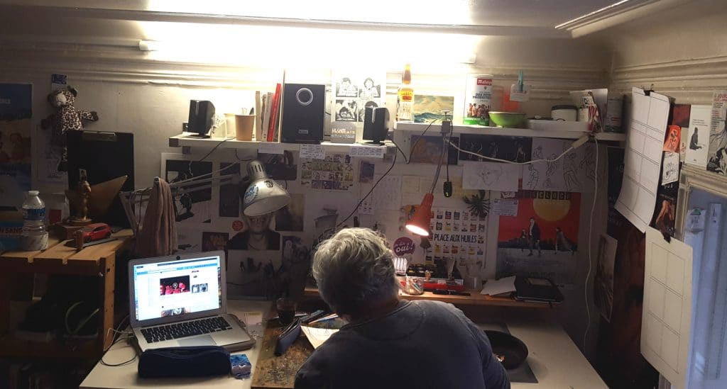 C’est que les compromis avec les éditeurs ne lui conviennent pas. Quitte à s’en passer parfois. “Ce qui compte, c’est l’histoire”, explique-t-il à son arrivée ce vendredi matin au Zarmatelier, espace de travail partagé avec quatre à cinq autres auteurs-illustrateurs. Dans la lumière montante qui s’engouffre dans l’étroite rue Ferrari, il travaille “dans la matière” : aquarelle, café, crayon de couleur en “couleur directe” – pas de coloriste ou d’ordinateur- sur un papier épais destiné à l’aquarelle. Son projet : une bande dessinée sur Al Idrissi, géographe d’Al Andalus passé par la Sicile.