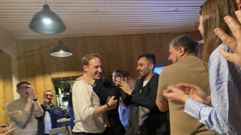Le nouveau maire d'Istres, Robin Prétot (LR), fête sa victoire avec ses soutiens. (Photo : Meriem Bioud)