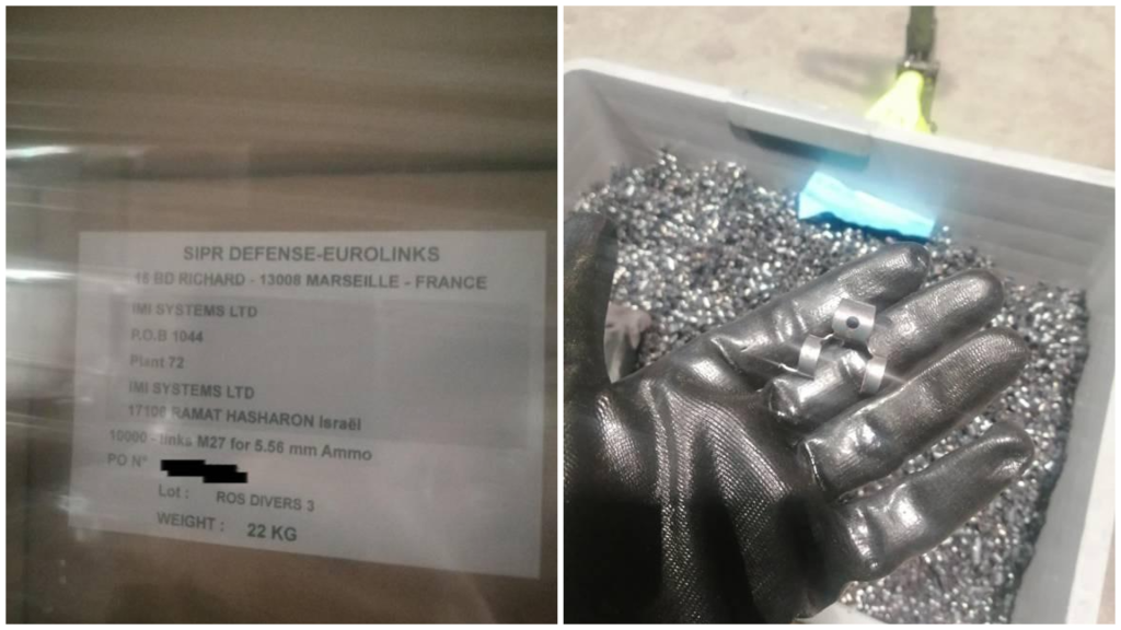 Effectivement essentiels au fonctionnement des fusils mitrailleurs, ces liens métalliques s’accrochent entre eux et accueillent chacun une balle, formant ainsi une chaîne de munitions qui permet de tirer en rafale sur une cible, à raison de 17 balles par seconde, d’après la chaîne Youtube de cet ancien soldat américain. Les liens destinés à IMI Systems sont de type M27, pour des munitions de 5.56 mm, d’après la photo du bordereau sur les cartons d’Eurolinks. S’ils sont conçus à l’origine pour les fusils de type M249, largement utilisés par l’armée américaine, ils sont tout à fait adaptés au Negev 5, l’un des fusils mitrailleurs de l’armée israélienne, que fabrique l’entreprise Israel Weapon Industries (IWI), une ex-filiale d’IMI Systems. “Israël a développé le fusil mitrailleur Negev précisément parce que les munitions de 5.56 mm sont omniprésentes au sein des pays de l’OTAN et de leurs alliés”, explique Shir Hever, économiste spécialiste de l’industrie israélienne de la sécurité et coordinateur du mouvement palestinien BDS pour un embargo militaire à l’encontre de l’État hébreu. “Les munitions 5.56 du Negev sont interchangeables avec les fusils M249”, confirme-t-il à notre partenaire Disclose.